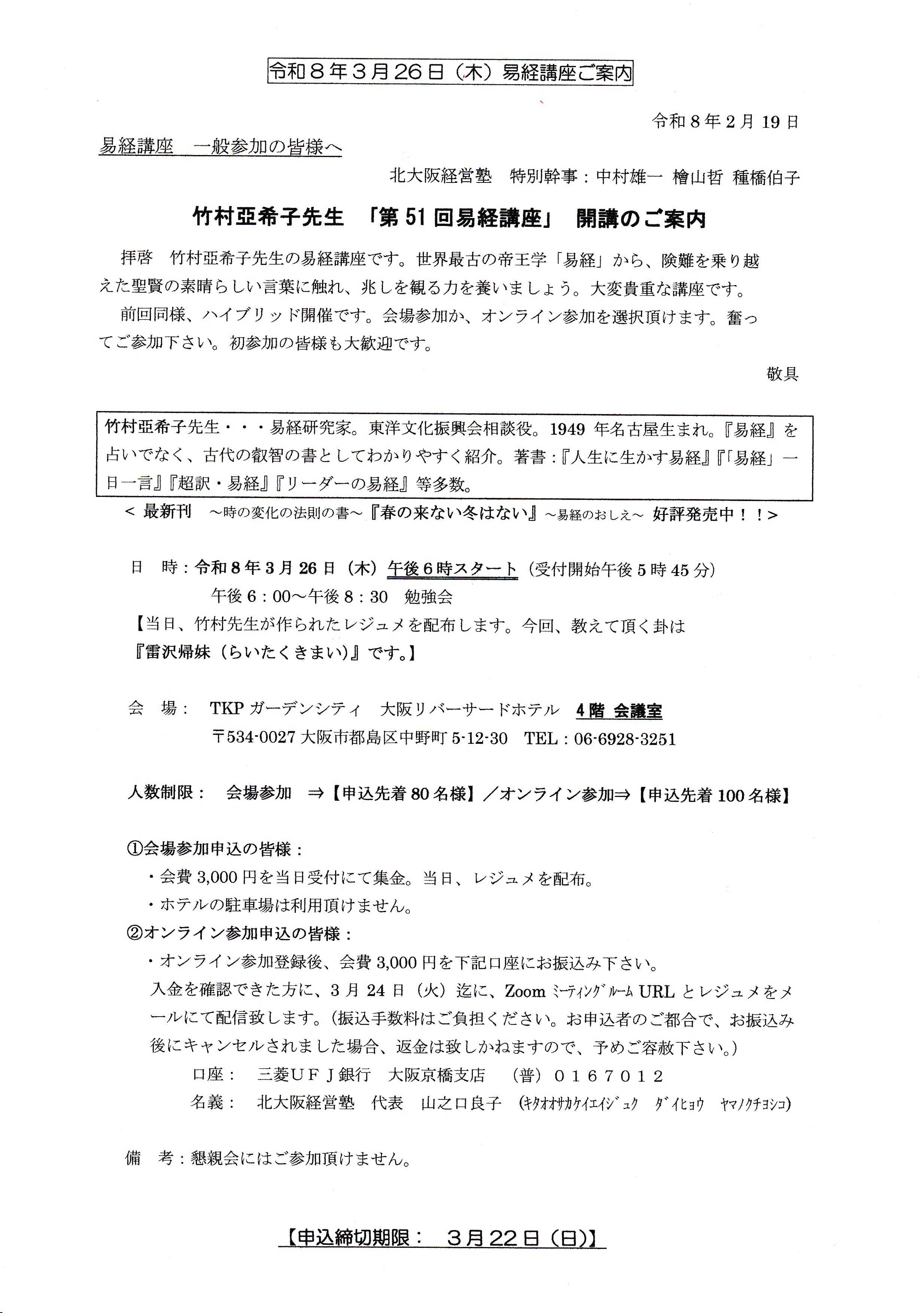 【竹村亞希子先生 「第51回易経講座」 開講のご案内】