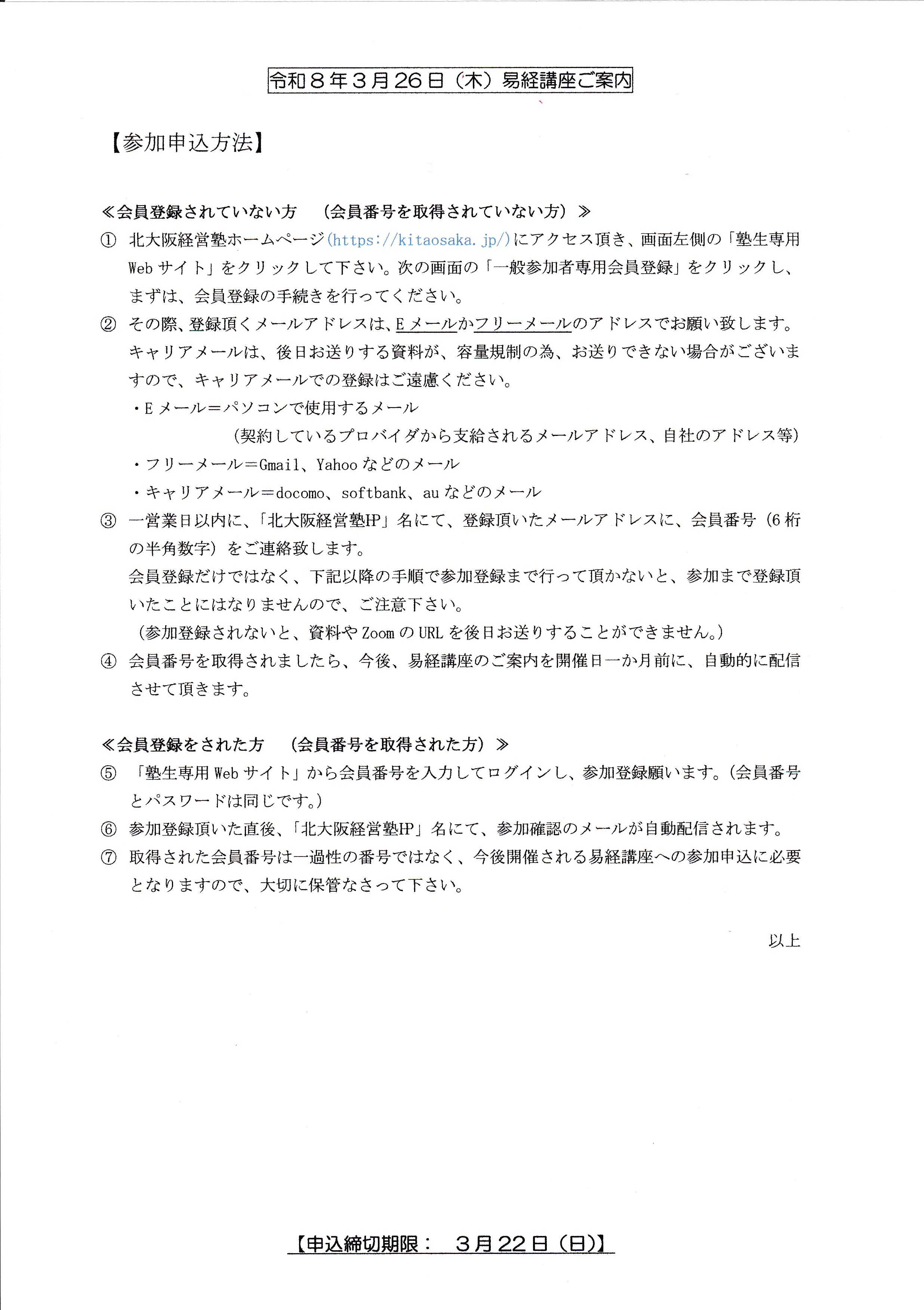 ④ 会員番号を取得されましたら、今後、易経講座のご案内を開催日一か月前に、自動的に配信させて頂きます。